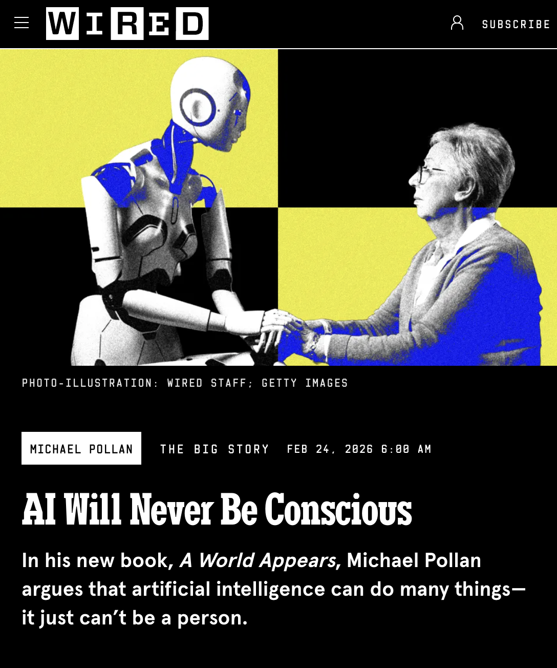 Michael Pollan in “AI Will Never Be Conscious” Wired, Feb. 24, 2026